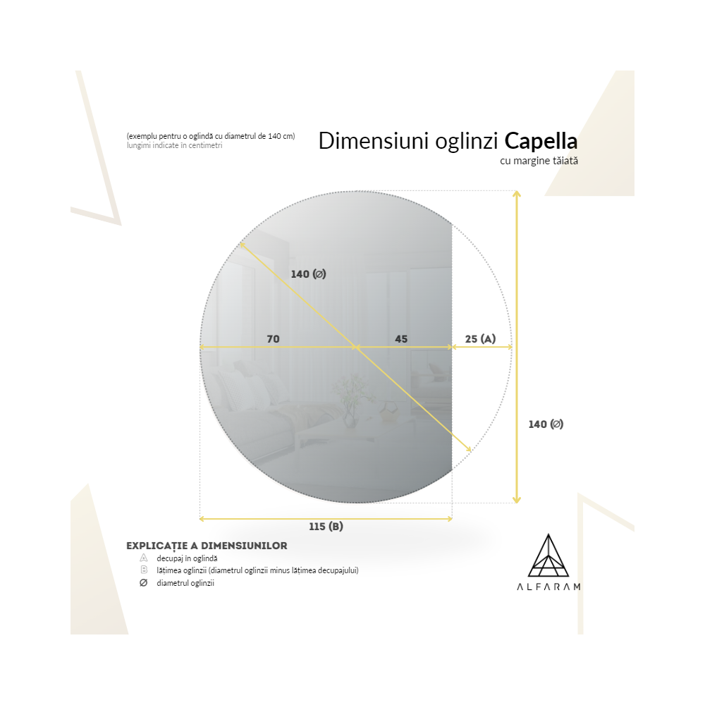 Dacă nu găsiți dimensiunea oglinzii de care aveți nevoie sau dacă aveți nevoie de o diviziune diferită- vă rugăm să ne contactați prin telefon sau e-mail. Cele mai mari oglinzi pe care le putem realiza sunt de 200x300cm și oglinzi rotunde cu un diametru de 200cm. Facem oglinzi la comandă individuală. Vă invităm să trimiteți cererea dumneavoastră împreună cu proiectul prin e-mail la oglinda@alfaram.ro.