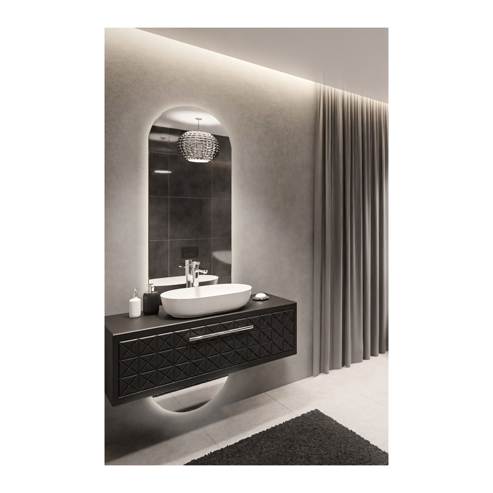 Iluminarea cu LED-uri se aprinde atunci când suprafața oglinzii este atinsă în punctul de comutare. Comutatorul este iluminat permanent - indiferent de iluminarea oglinzii. Iluminarea comutatorului face ca acesta să fie ușor de găsit, chiar și pe întuneric.