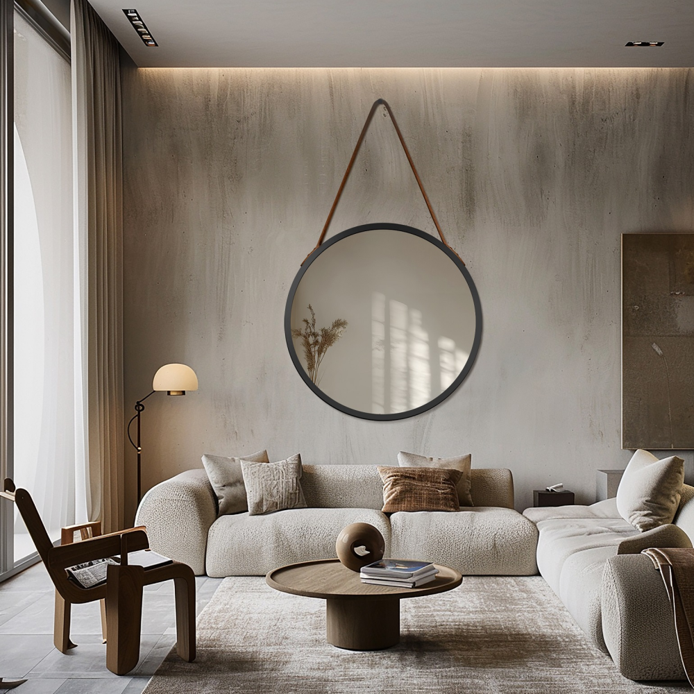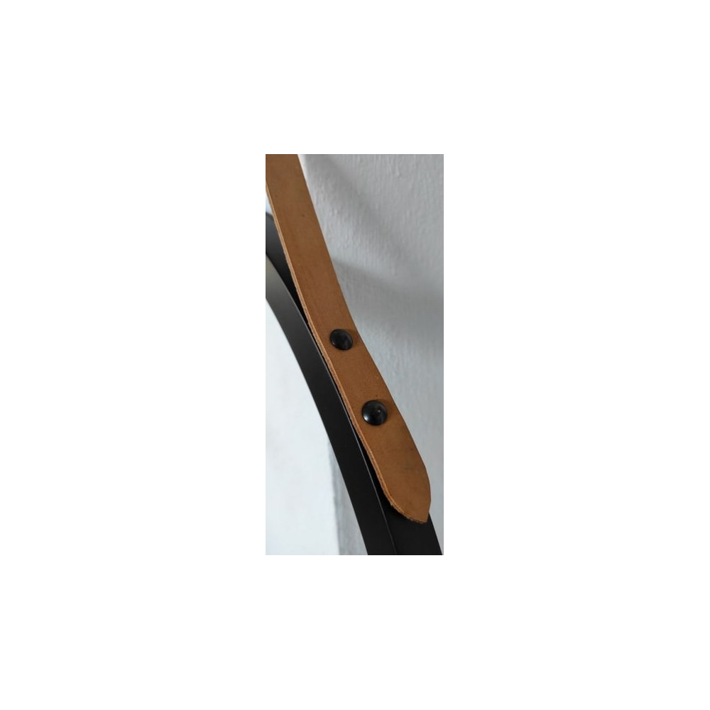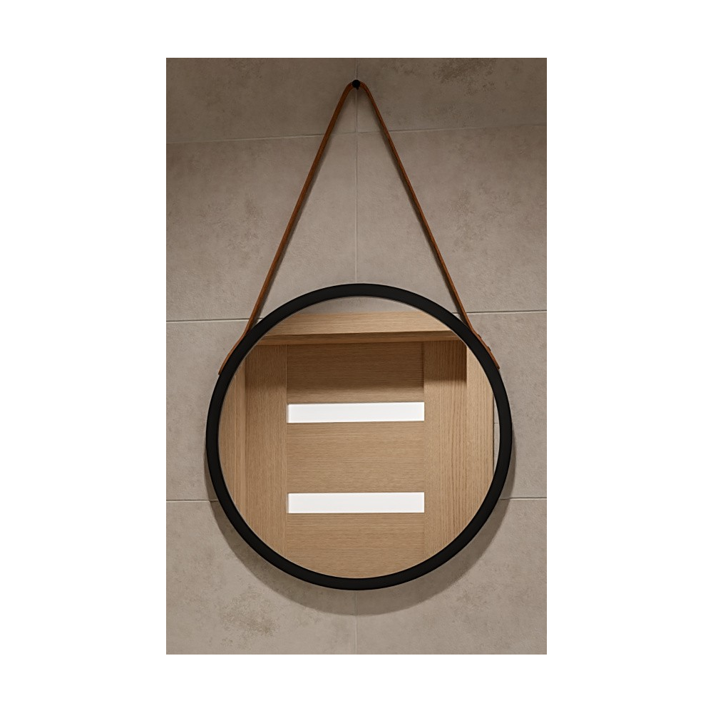 Oglindă rotundă cu ramă neagră mată și curea din piele maro - OTTO BANDĂ BRONZE - culoarea ramei la alegere