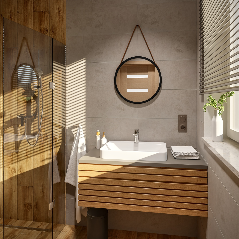 O opțiune de bază în care oglinda necesită o conexiune la rețeaua de 230 V. Înainte de instalare, trebuie avut grijă să se pregătească o conexiune estetică și sigură.