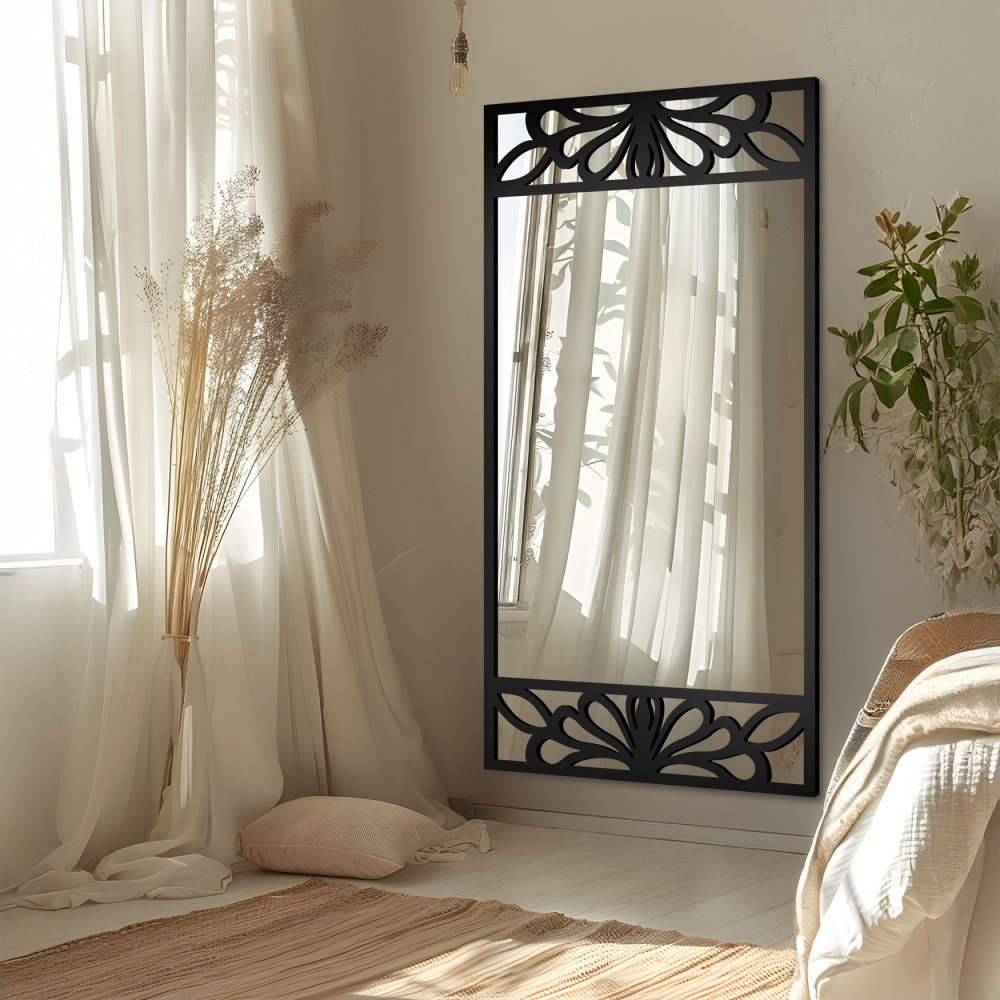 Forma sa dreptunghiulară îi conferă un caracter modern, în timp ce partea inferioară a ramei este decorată cu un motiv floral sofisticat.