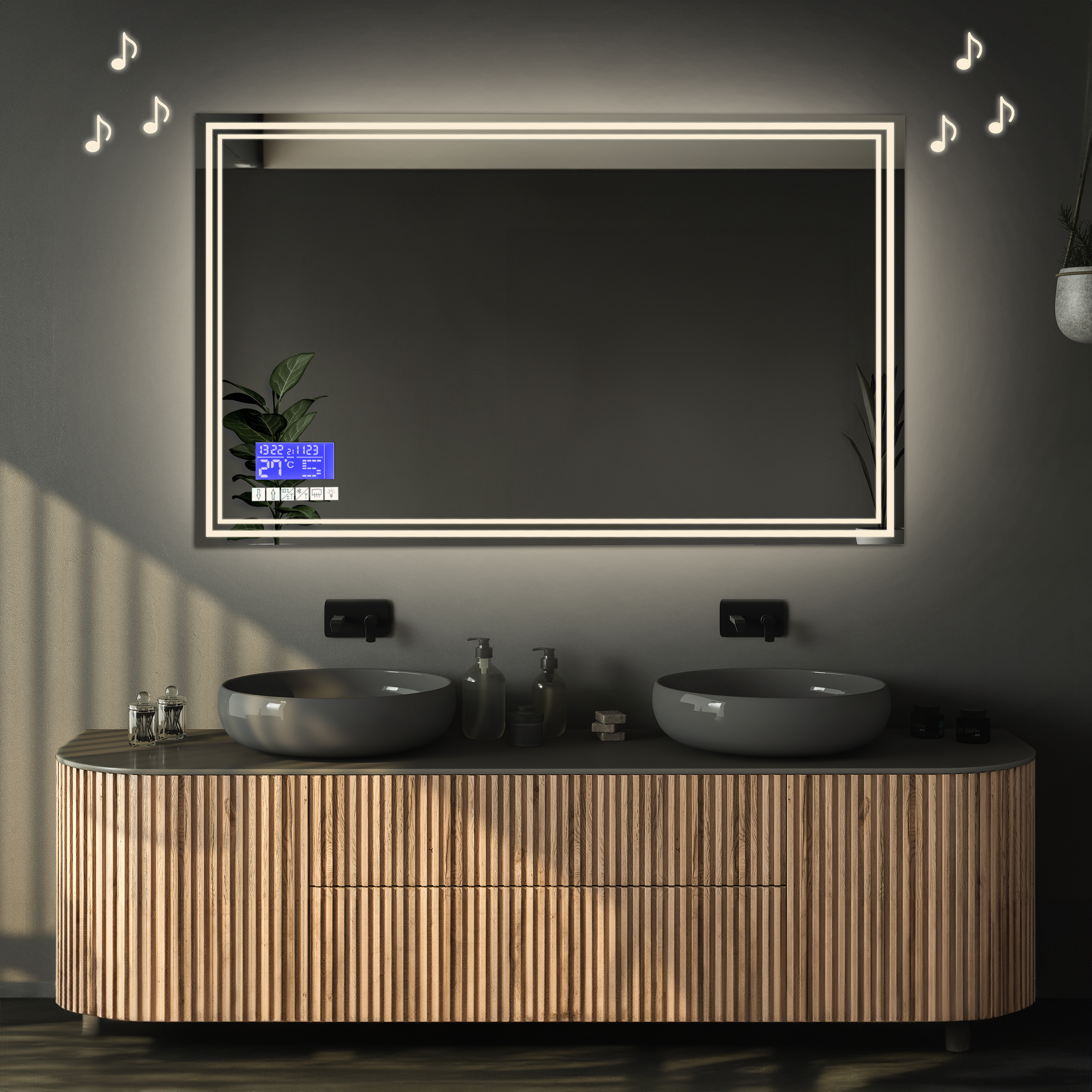 Panou tactil cu radio și bluetooth- Această soluție este dedicată celor care caută luxul și confortul tehnologic. Este un set format dintr-un panou tactil cu 6 butoane pentru oglindă și un difuzor Bluetooth. Panoul tactil controlează o serie de funcții, inclusiv iluminarea, reglarea intensității luminoase, controlul covorului de încălzire, radioul și redarea de muzică prin Bluetooth. În plus, acesta afișează data curentă, ora, temperatura și are o funcție de memorare a ultimei stări înainte de a se stinge.