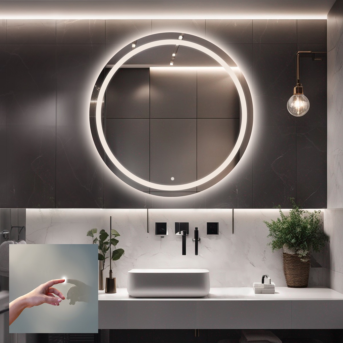Întrerupător tactil - Întrerupătorul tactil este un dispozitiv inovator care vă permite să controlați iluminarea oglinzii prin atingere. Modulul este integrat în suprafața oglinzii, ceea ce adaugă eleganță și modernitate aspectului general. Iluminarea comutatorului face ca acesta să fie ușor de găsit, chiar și pe întuneric.
